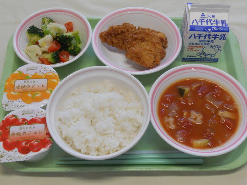 | コメント | 中華丼は具材が豊富で、食感を楽しみながら食べることができました。ちくわを入れたことはないのですが、おいししいしボリュームも出る、だしも出るのでいいですね。焼き餃子も、皮もあんもおいしかったです。“売れます”と言ってしまうくらい大満足でした。生徒達も好きなメニューだと思います。また、ゼリーに入っていたナタデココも、給食で食べたのは初めてでした。 |