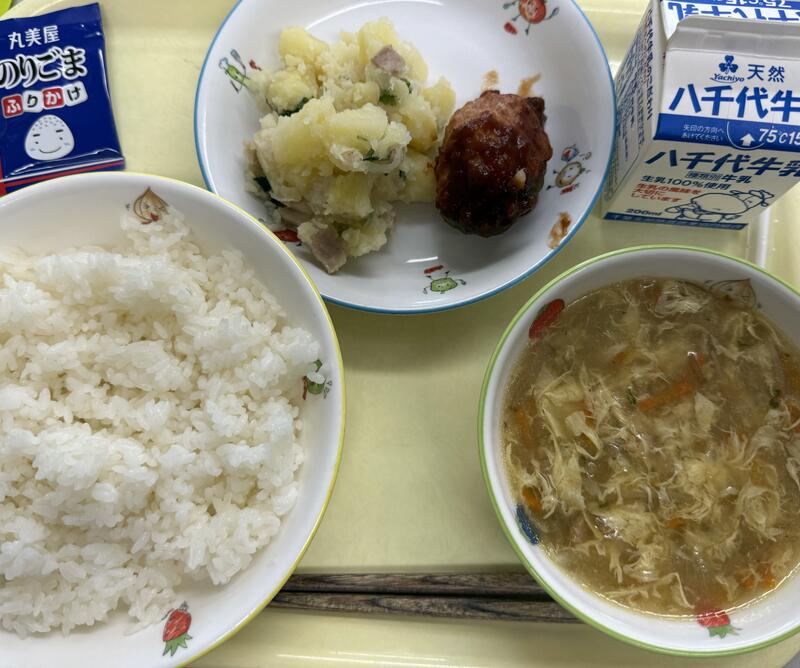 | コメント | 今日からいよいよ給食が始まりました。最初の給食は、「ハヤシライス」です。やわらかくてよく噛まずに食べれてしまいますが、しっかりよく噛んで食べましょう。よく噛んで食べると、お腹の調子が良いだけでなく、栄養もたっぷりと摂ることができます。 |