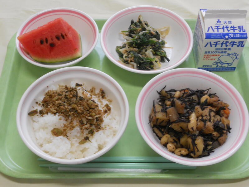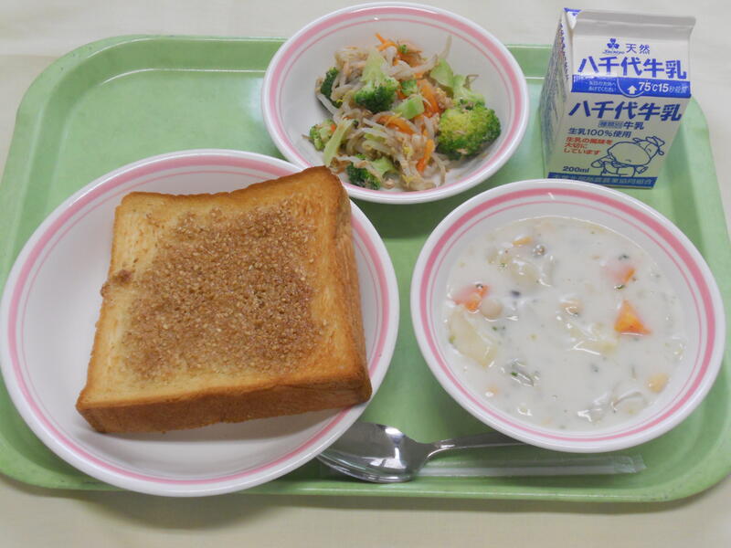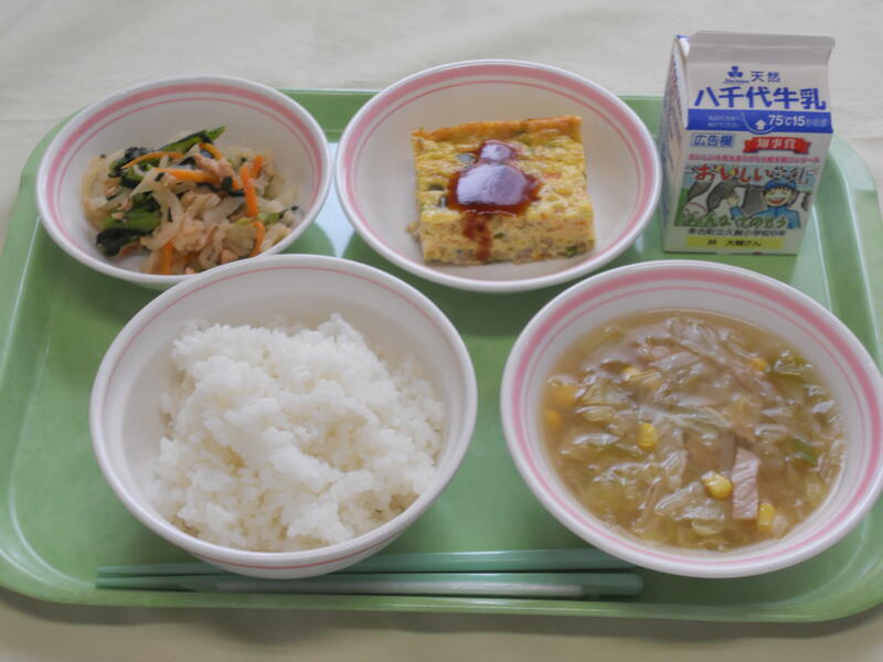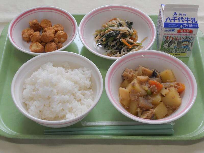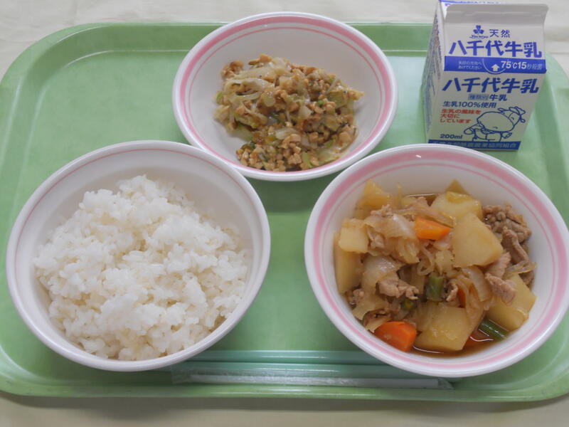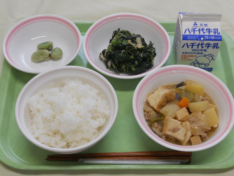 | コメント | ぶた肉、生あげ、なたね油、さとう、じゃがいも、にんじん、たまねぎ、たけのこ、しいたけ、きぬさや、のり、そらまめ、米、牛乳、20品目以上の食材のときもありますが、生あげの肉みそ煮が具の多さを感じさせてくれました。とてもおいしくいただきました。ポパイサラダのネーミング…なつかしいです。今の子どもたち、由来わかるのかなと考えてしまいました。中学部ががんばったそらまめもおいしかったです。 |