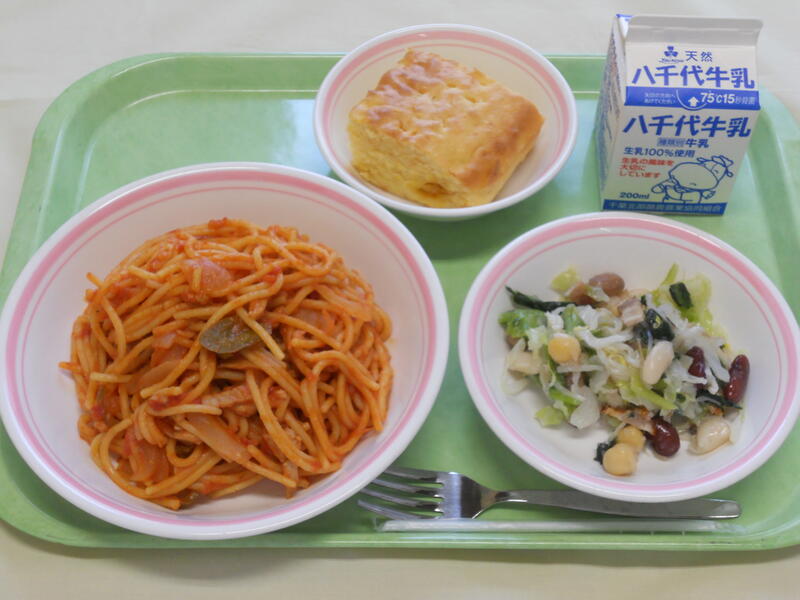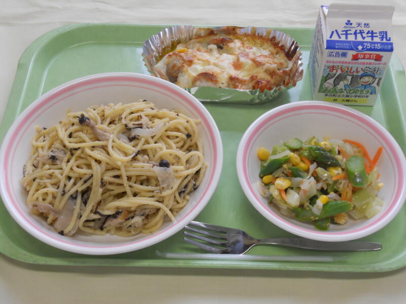 たらこスパゲティ かぼちゃのチーズ焼き アスパラサラダ 牛乳 |