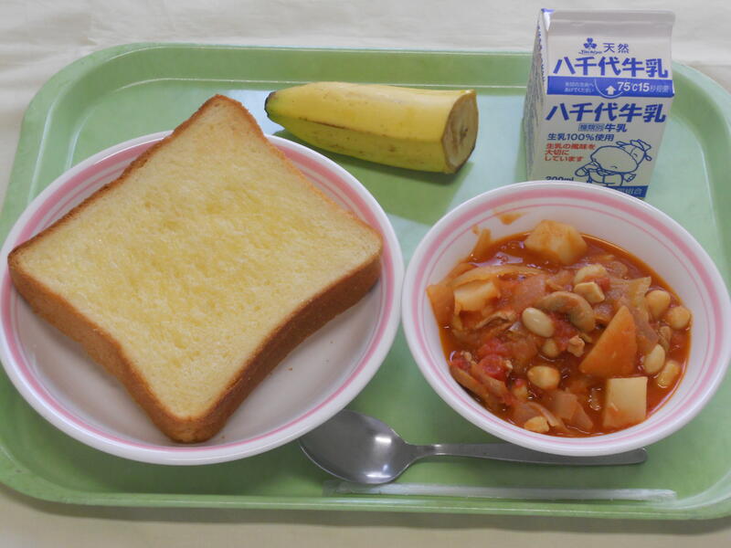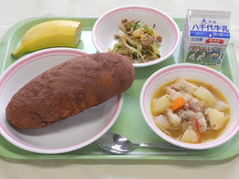ココア揚げパン ポトフ 焼肉サラダ バナナ 牛乳 |