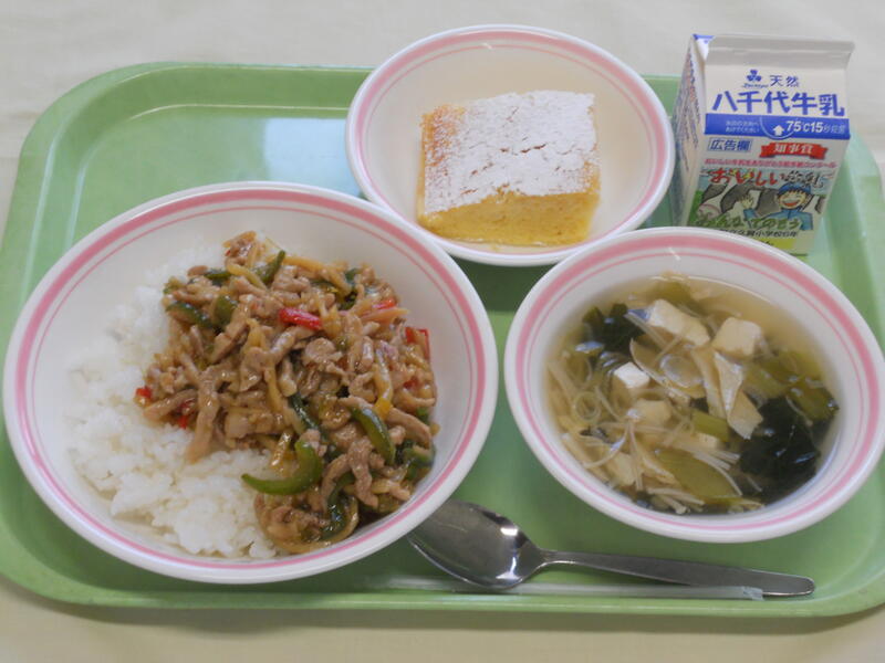 ごはん チンジャオロース丼(具) わかめスープ スイートポテトパンケーキ 牛乳 |