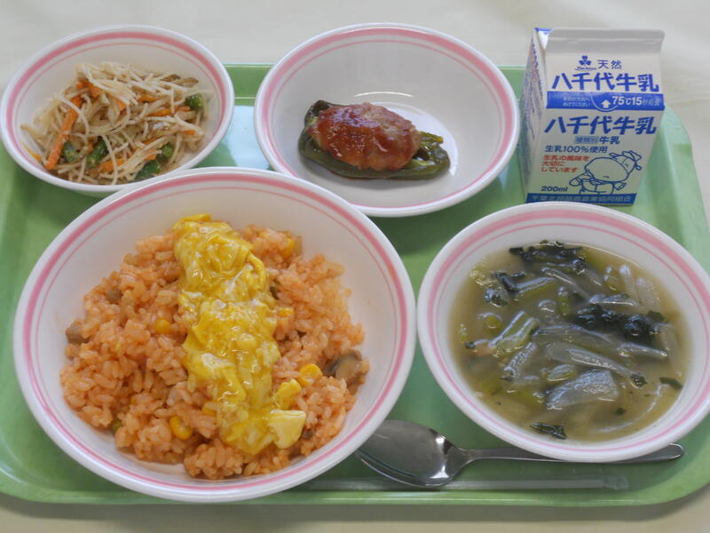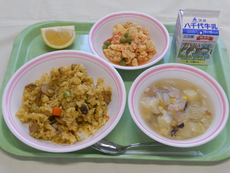 カレーピラフ トマトと卵のソテー キャベツスープ 小夏 牛乳 |