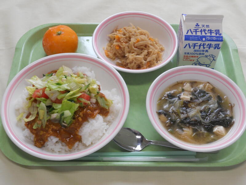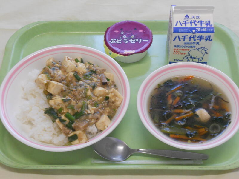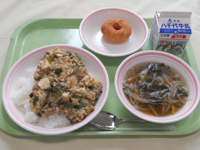 ごはん 麻婆豆腐丼(具) もやし中華風スープ おからドーナッツ 牛乳 |