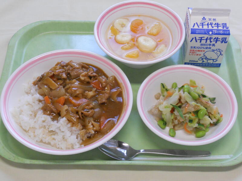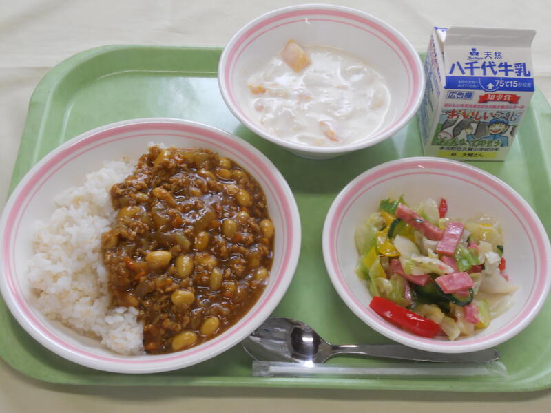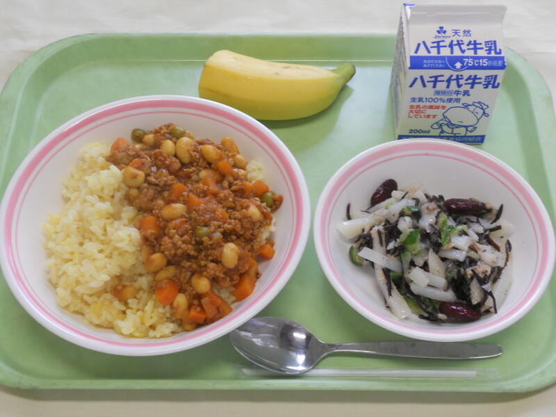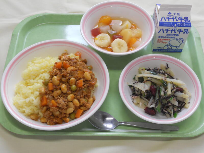 玄米ごはん 大豆入りキーマカレー イタリアンサラダ フルーツヨーグルト 牛乳 |