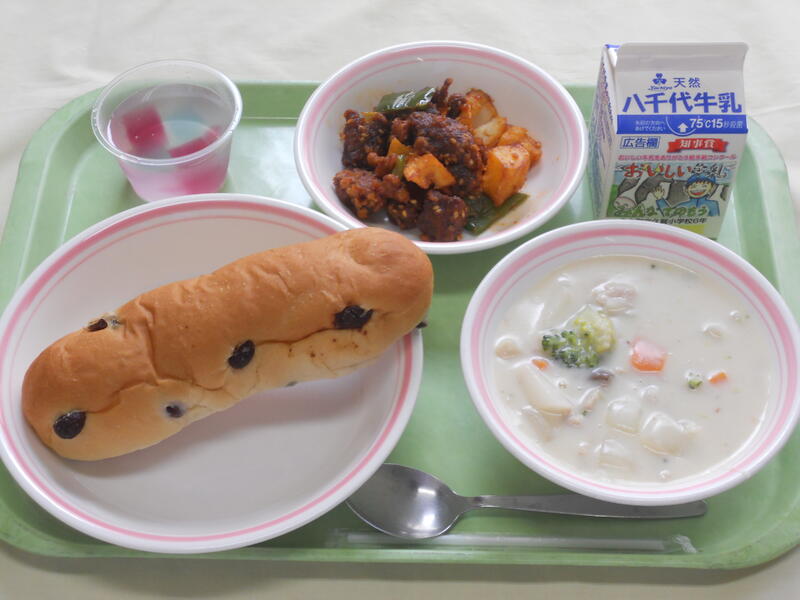 ぶどうパン レバーとーポテトのケチャップ和え ホワイトシチュー ソーダゼリー 牛乳 |