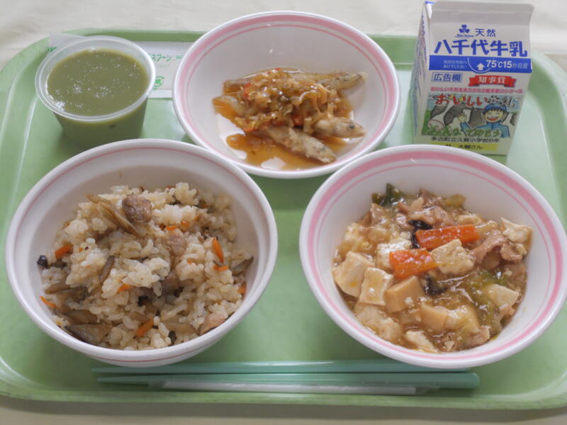 鶏五目ごはん わかさぎの南蛮漬け 五目豆腐 抹茶豆乳ゼリー 牛乳 |