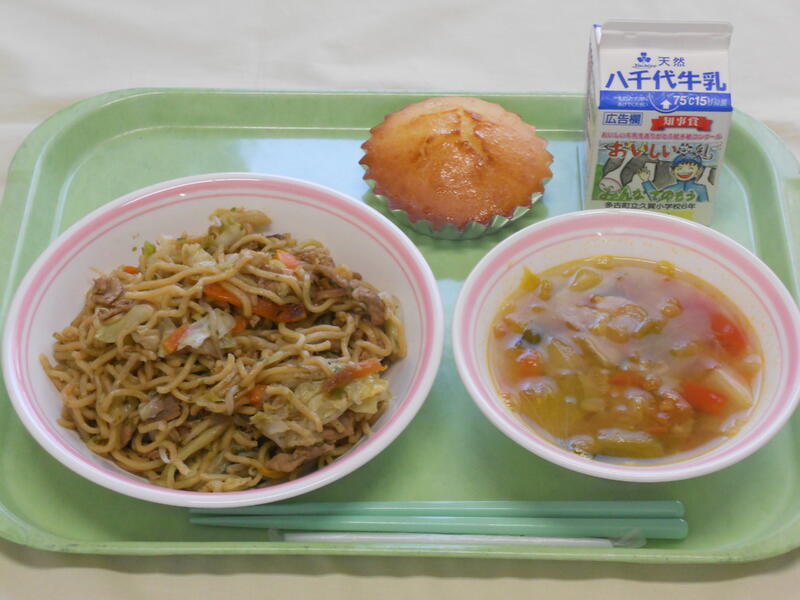 ソース焼きそば レタススープ 米粉のレモンカップケーキ 牛乳 |