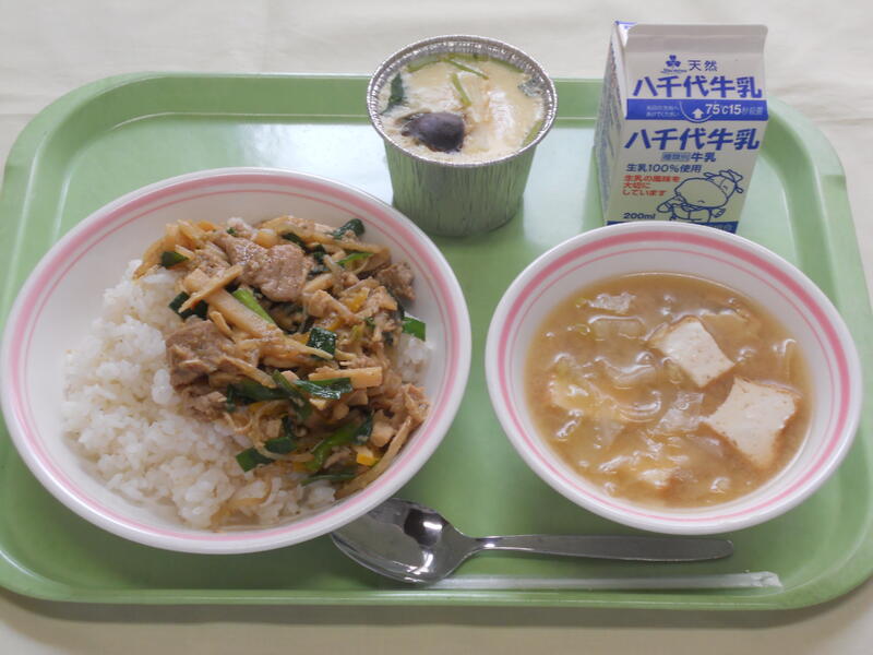 アマランサスごはん 炒め焼肉丼(具) 茶碗蒸し 生揚げとキャベツのみそ汁 牛乳 |