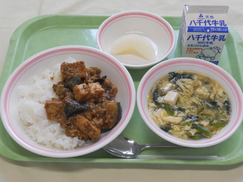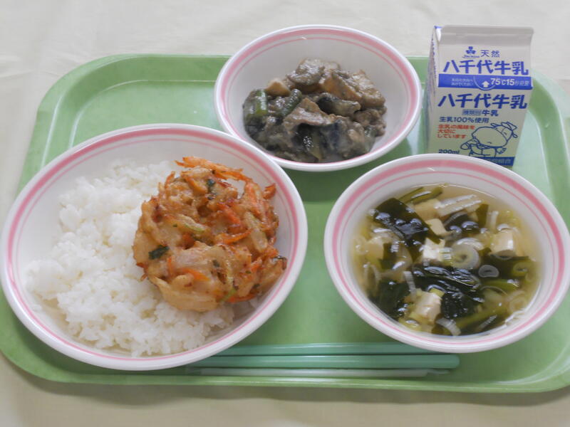 ごはん かみかみかき揚げ丼(具) なすと生揚げのみそ炒め 小松菜とわかめのすまし汁 牛乳 |