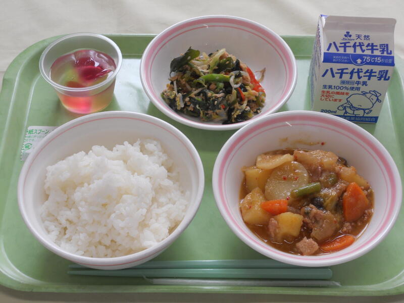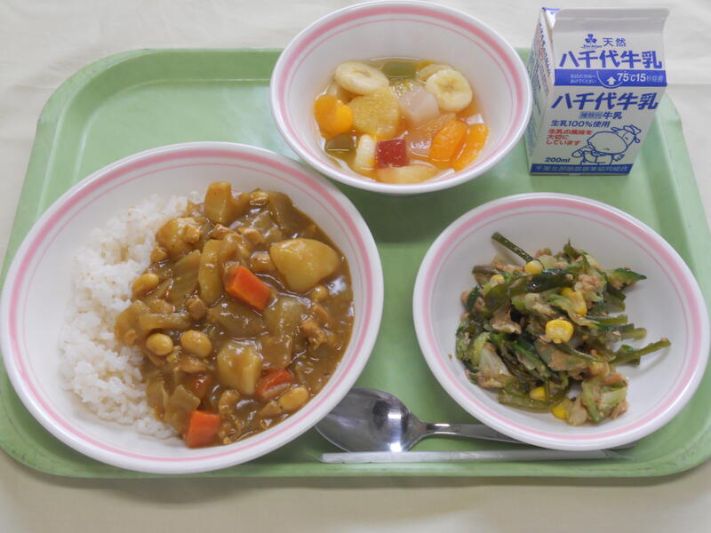 アマランサスごはん 大豆とれんこんのカレー 茎わかめのツナサラダ カクテルゼリー和え 牛乳 |