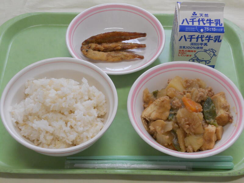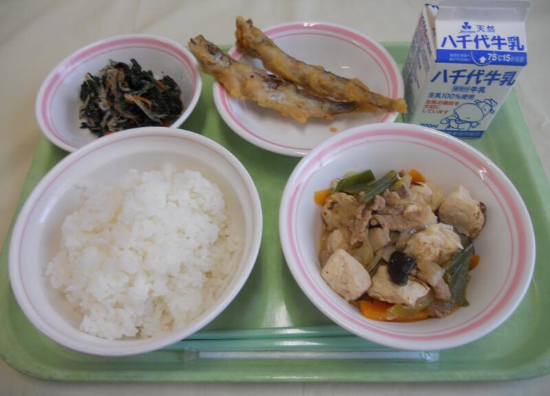 玄米ごはん わかさぎの唐揚げ 生揚げの肉みそ煮 牛乳 |
