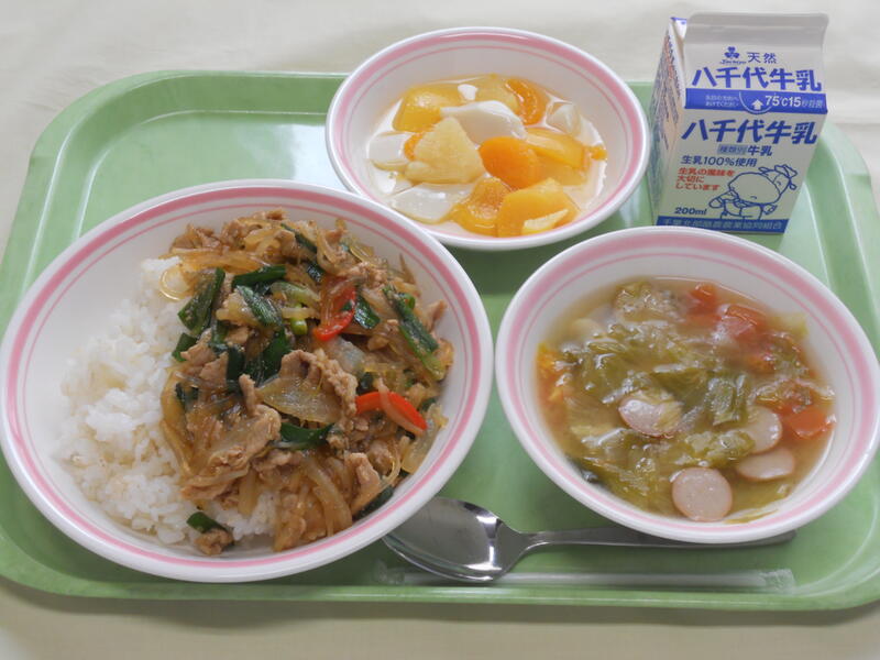 | コメント | 給食の人気メニュー、キムタクごはんは、味のついたお肉、たくあん、キムチが入って、でも辛さはあまりなく、おいしかったです。鶏団子ちゃんこ汁は、やさしい塩味のスープに具がたくさん入り、体もあたたまりました。ごちそうさまでした。 |