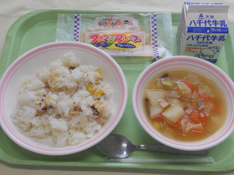 | コメント | カレーピラフは、具材とごはんがよく混ざり合っていて、おいしかったです。スープもやわらかく煮込んであり、食べやすく、おいしくいただきました。ごちそうさまでした。 |