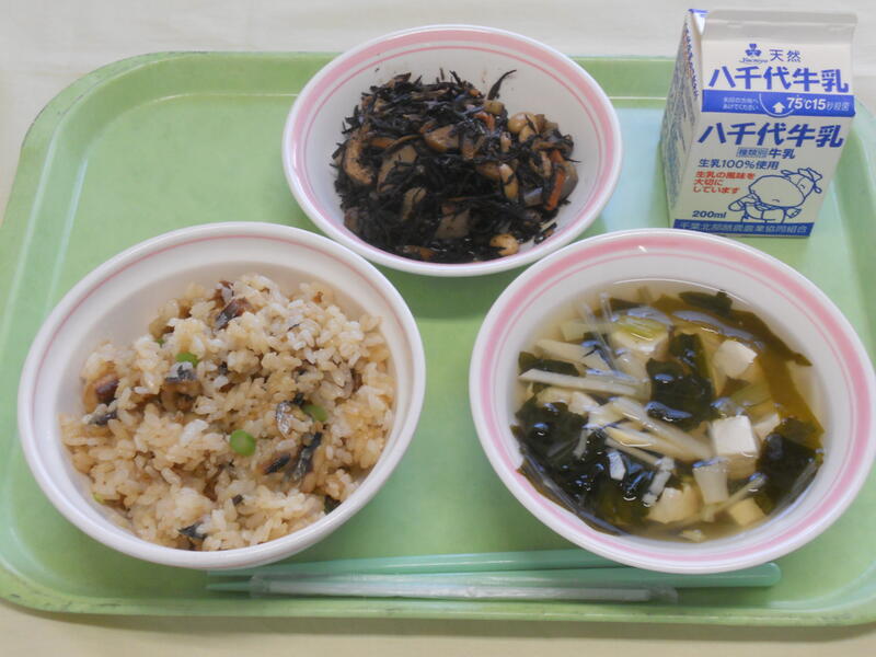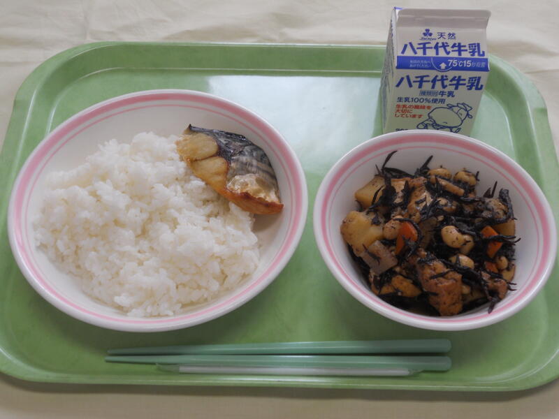 さんまごはん 大豆とひじきの炒り煮 小松菜とわかめのすまし汁 牛乳 |