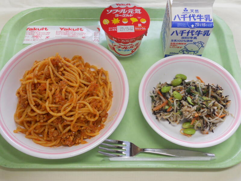スパゲティ・ボロネーゼ ツナサラダ ヨーグルト(既製品) 牛乳 |