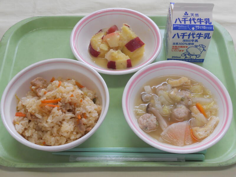 キムタクごはん 鶏団子ちゃんこ汁 さつま芋とりんごのレモン煮 牛乳 |