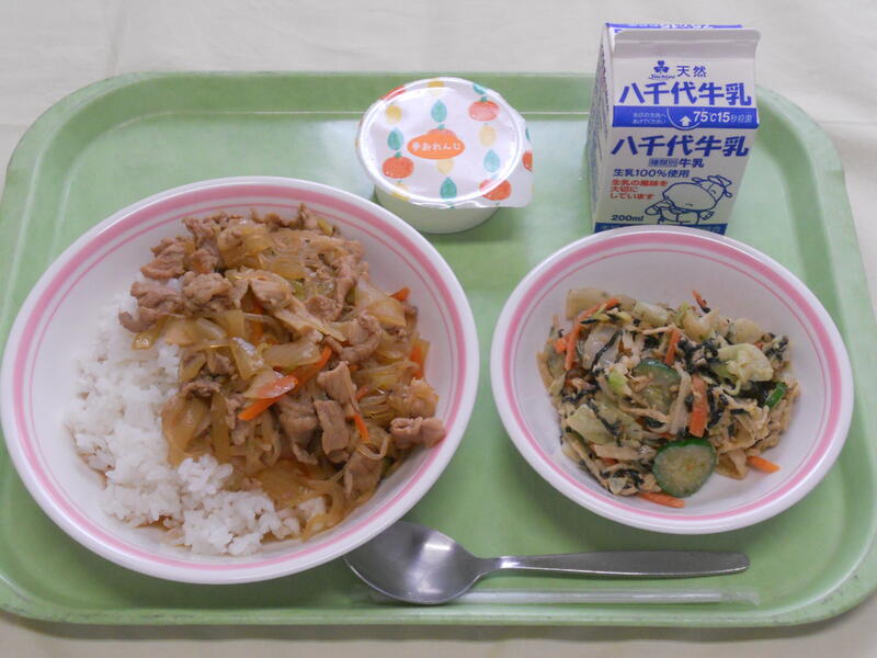 ごはん 豚丼(具) 切干大根ののりごまサラダ オレンジゼリー(既製品) 牛乳 |