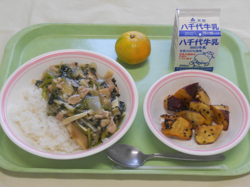 ごはん 小松菜と豚肉のあんかけ丼 大学芋 みかん 牛乳 |