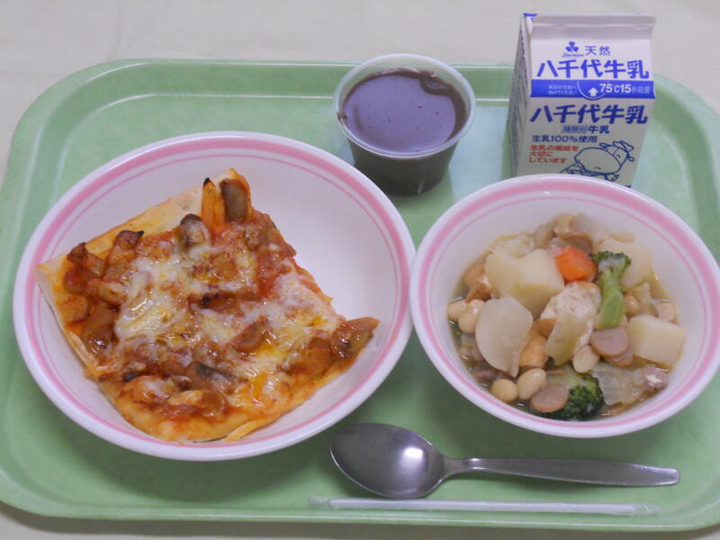 ピザ ポトフ 豆乳ココアプリン 牛乳 |