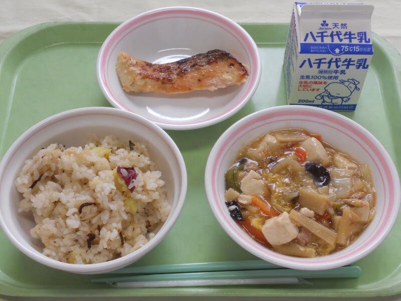 さつまいもと塩昆布ごはん 鮭のみそマヨネーズ焼き 五目豆腐 牛乳 |