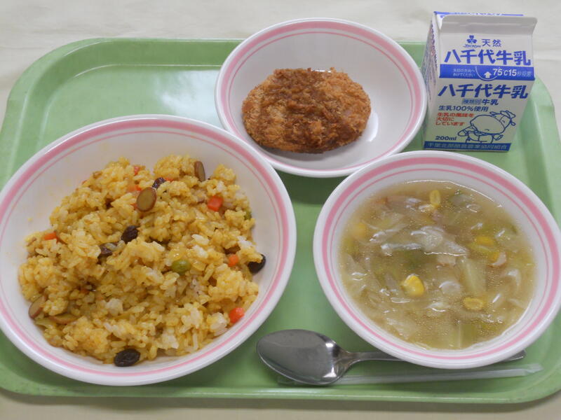 カレーピラフ キャベツメンチカツ(既製品) 野菜のとろみスープ 牛乳 |
