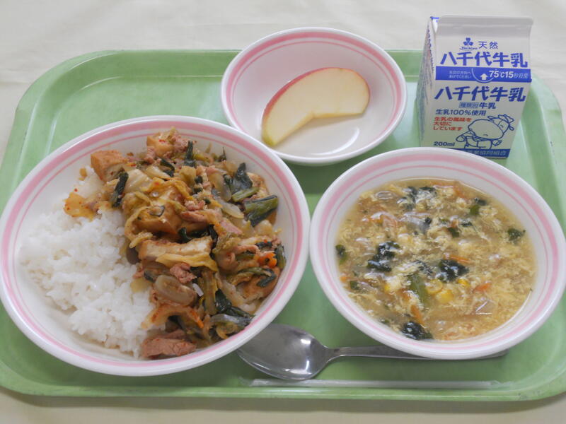 ごはん 豚キムチ丼(具) 中華風コーンスープ りんご 牛乳 |