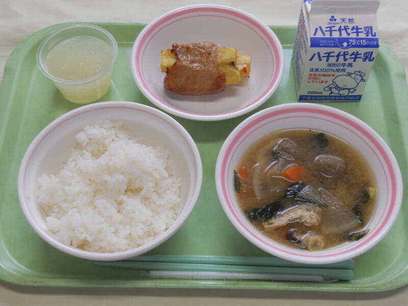 ごはん 豚肉のさつまいもチーズ巻き 千葉っ子つみれ汁 梨ゼリー 牛乳 |
