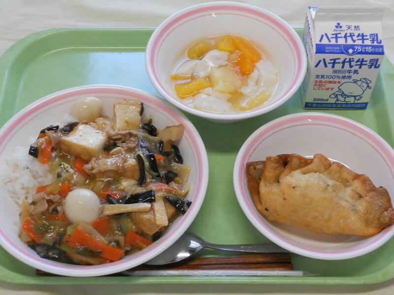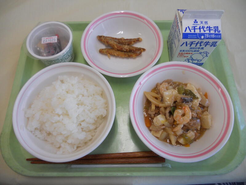 ごはん いかのかりん揚げ 家常豆腐 牛乳 |