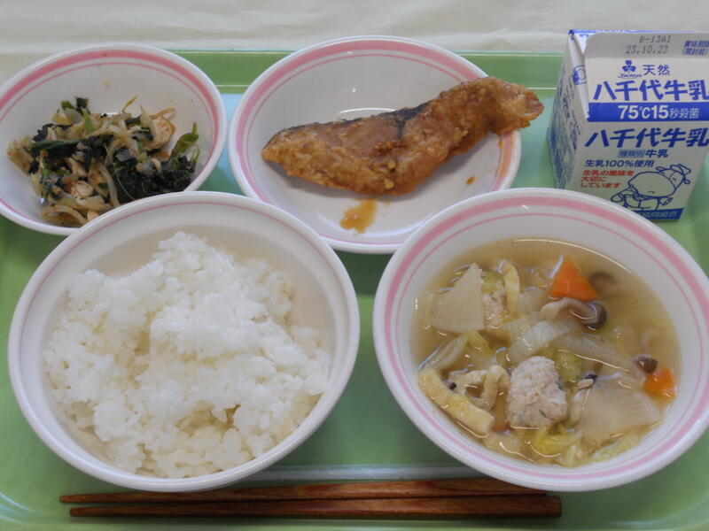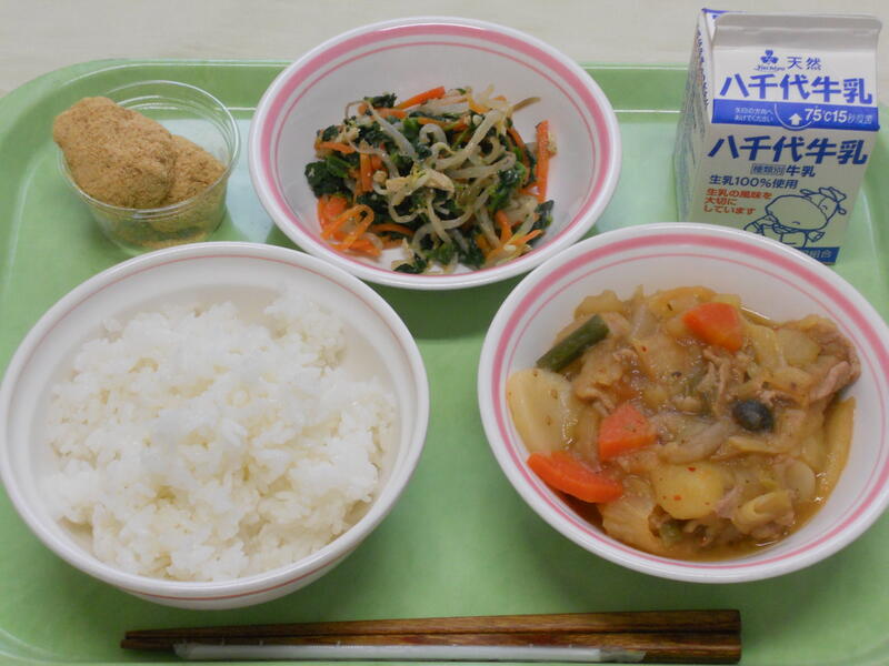 | コメント | おはなし給食のごぼう、にんじん、大根がきんぴらとみそ汁に入っていました。今日は気温も低くなったので、あたたかいおみそ汁はうれしく、大根にもしっかり味がしみておいしかったです。からあげも、さくさくして、味もしっかりついていました。リクエストに応えて2つにしていただき、ありがとうございました。 |