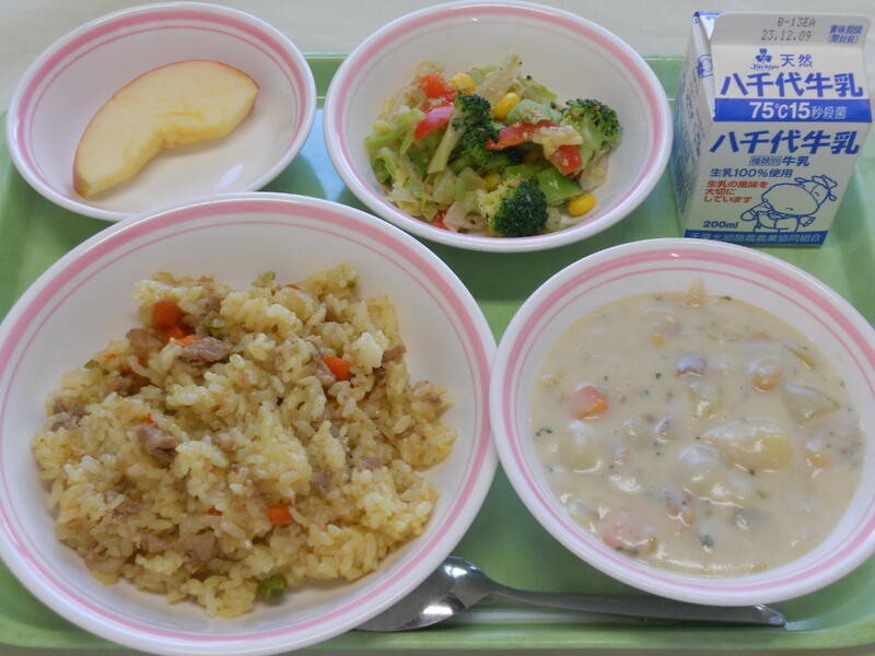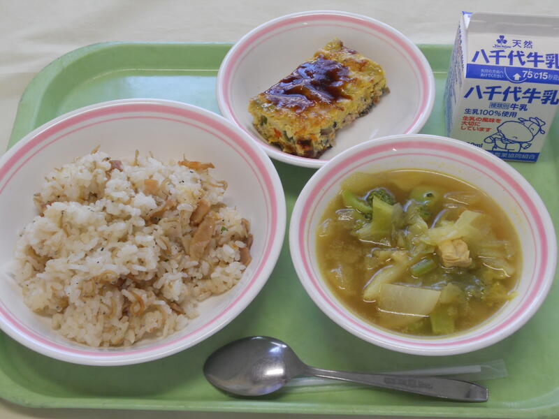じゃこガーリックライス 挽き肉オムレツ 野菜カレースープ 牛乳 |