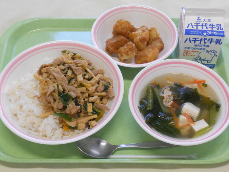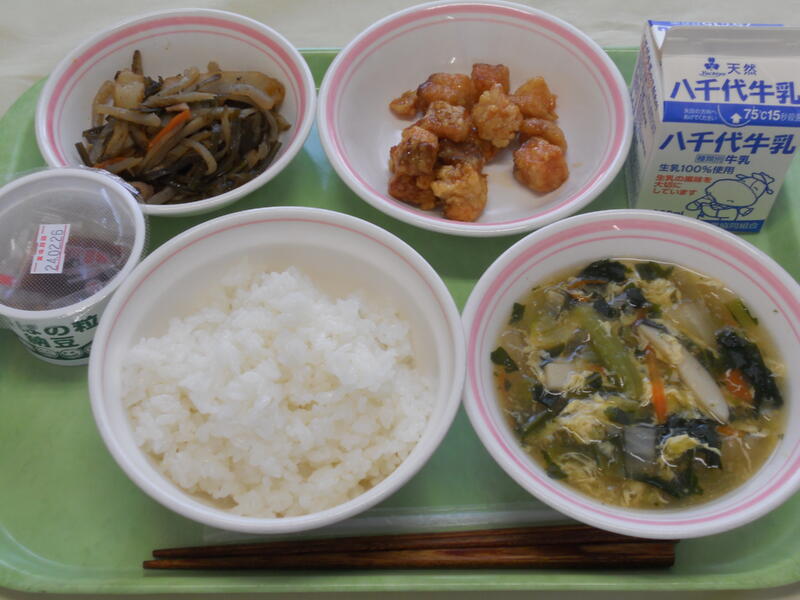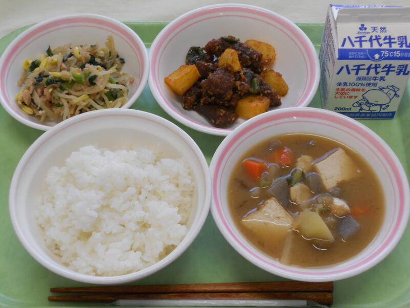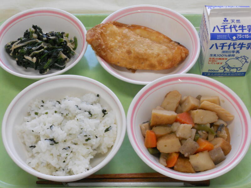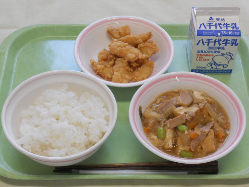 ごはん 鶏のから揚げ 五目きんぴら 生揚げと大根のみそ汁 牛乳 |