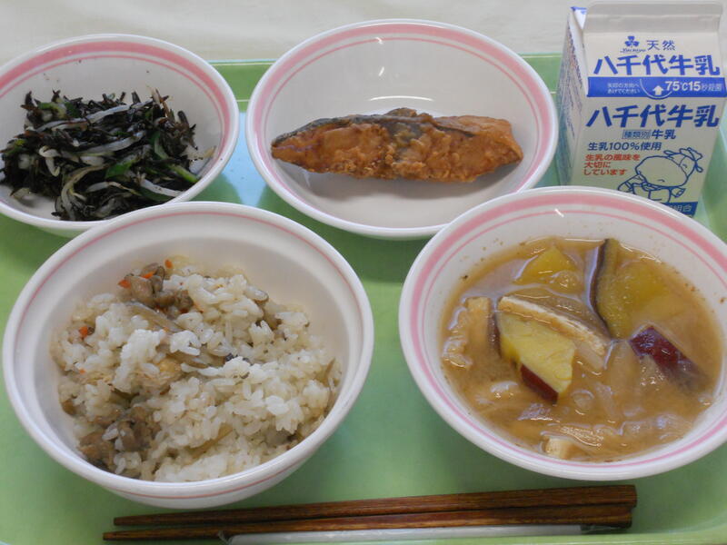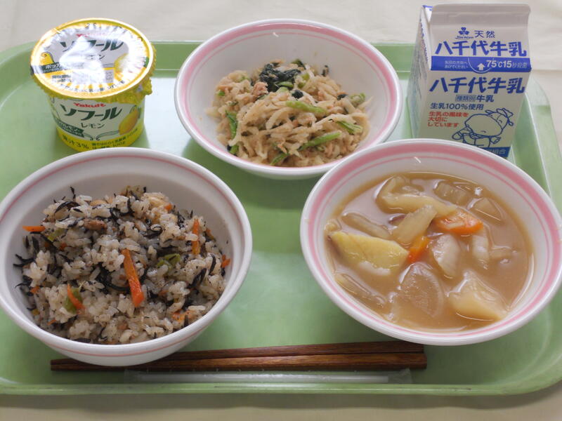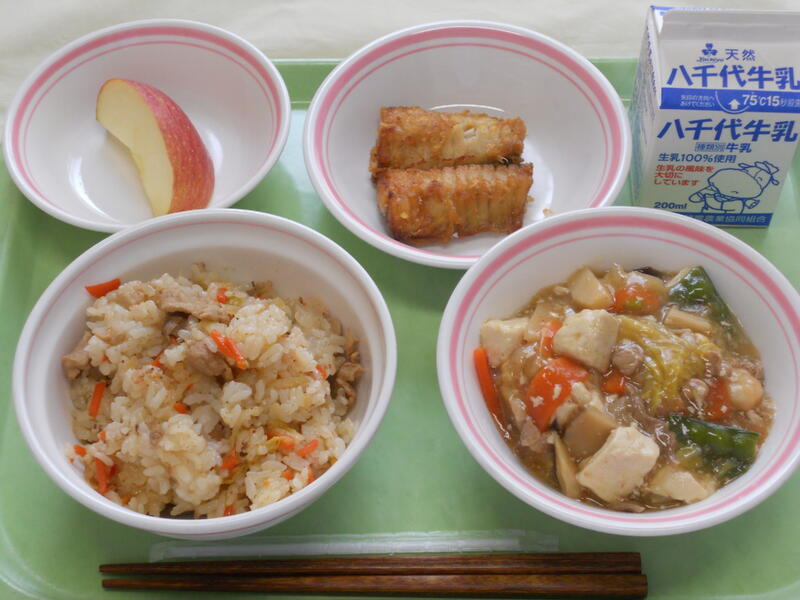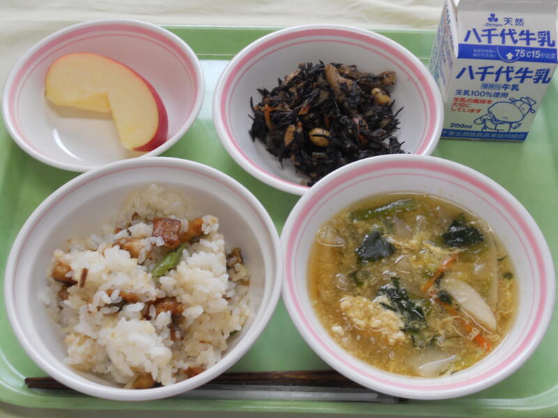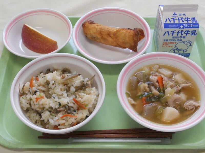 あさりごはん ひじき春巻き 芋煮汁 りんご 牛乳 |