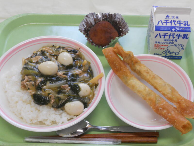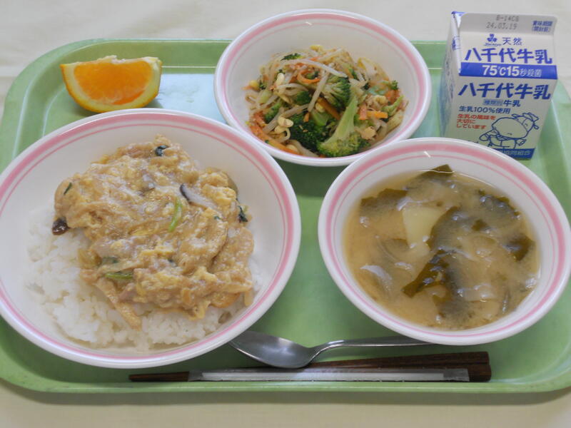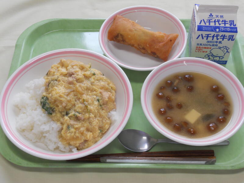 ごはん 親子丼(具) 切干大根の春巻き なめこ汁 牛乳 |