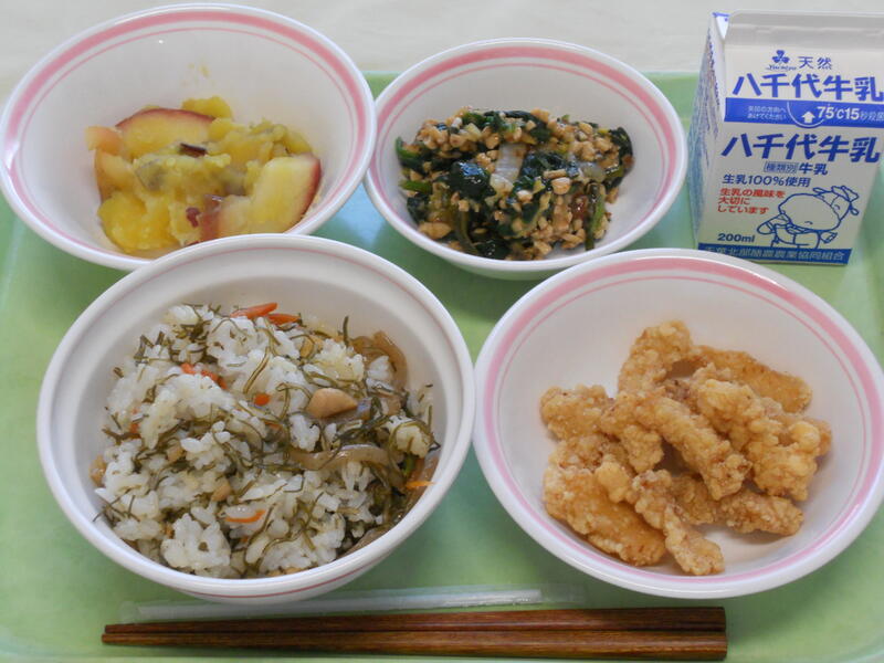 昆布ごはん いかのかりん揚げ 茎わかめの納豆あえ さつまいもとりんごのレモン煮 牛乳 |