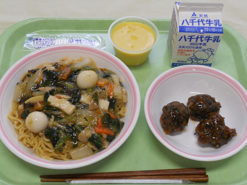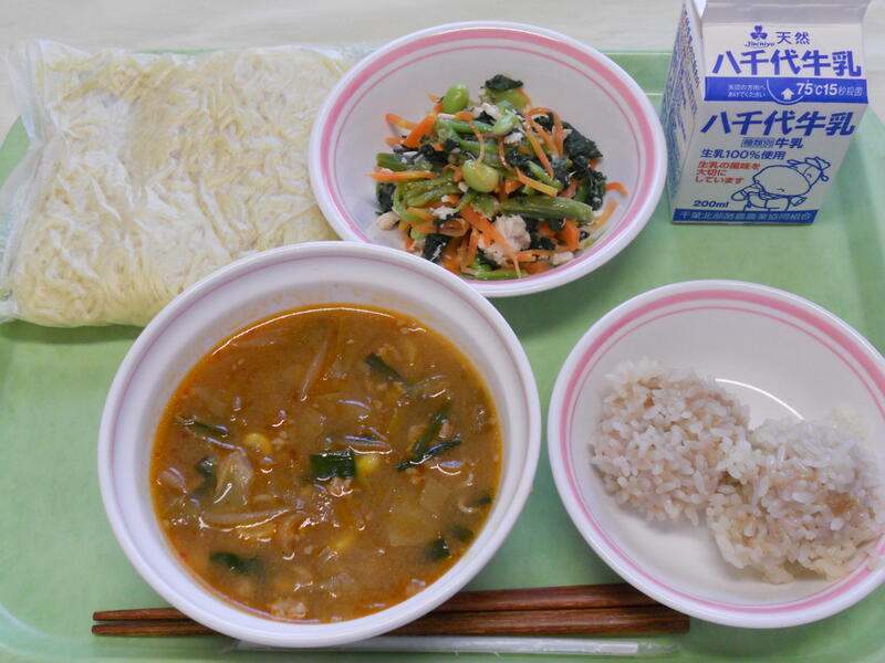 | コメント | 給食で食べたい料理のリクエスト第1位のラーメンでした。みそ味のスープはピリ辛で、具もたくさん入っていて、おいしくいただきました。もち米しゅうまいは、モチモチジューシーでした。小松菜サラダは、小松菜と人参、枝豆の組み合わせが彩りよく、食欲をそそられました。おいしかったです。ご馳走様でした。 |