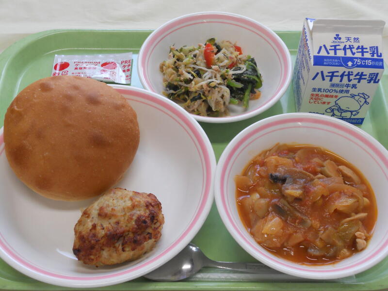バンズパン(セルフバーガー) ハンバーグ チキンのトマト煮 海藻和え 牛乳 |