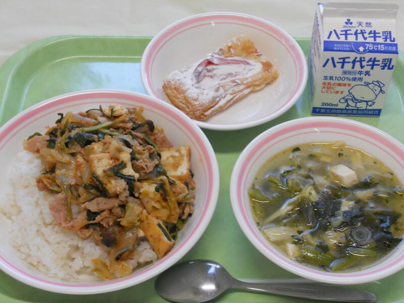 | コメント | リクエスト献立の豚キムチ丼は、具材にしっかり味がついていて、キムチの酸味と辛みがちょうどよく、とてもおいしかったです。リクエストしてくれたクラスに感謝です。アップルパイは、サクサクのパイに甘く煮たリンゴがマッチして、うれしいデザートでした。ごちそう様でした。 |
