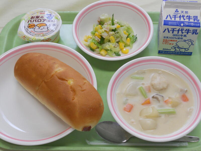さつまいもパン ホワイトシチュー(米粉) コールスローサラダ お米のババロア 牛乳 |