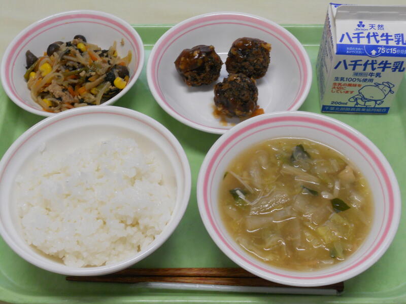 ごはん 肉団子の甘酢あんかけ しらたき炒め 中華風白菜スープ 牛乳 |