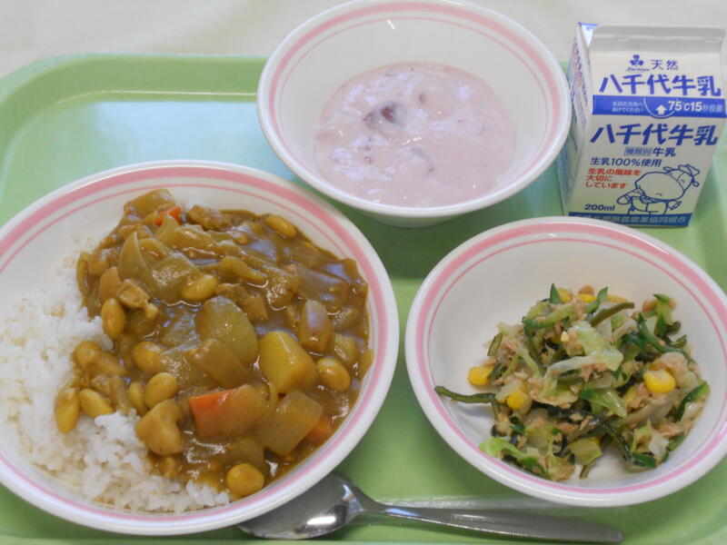 アマランサスごはん チキンカレー 豆と野菜の和風サラダ カクテルゼリー和え 牛乳 |