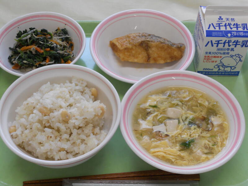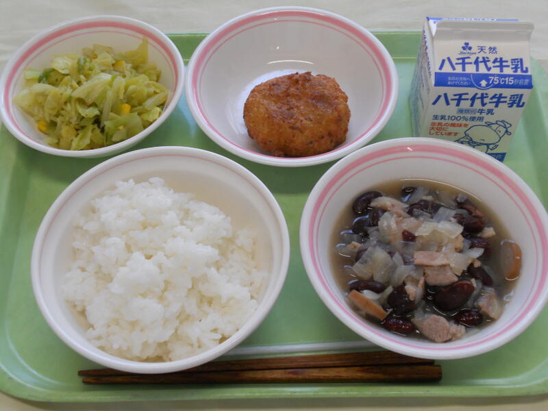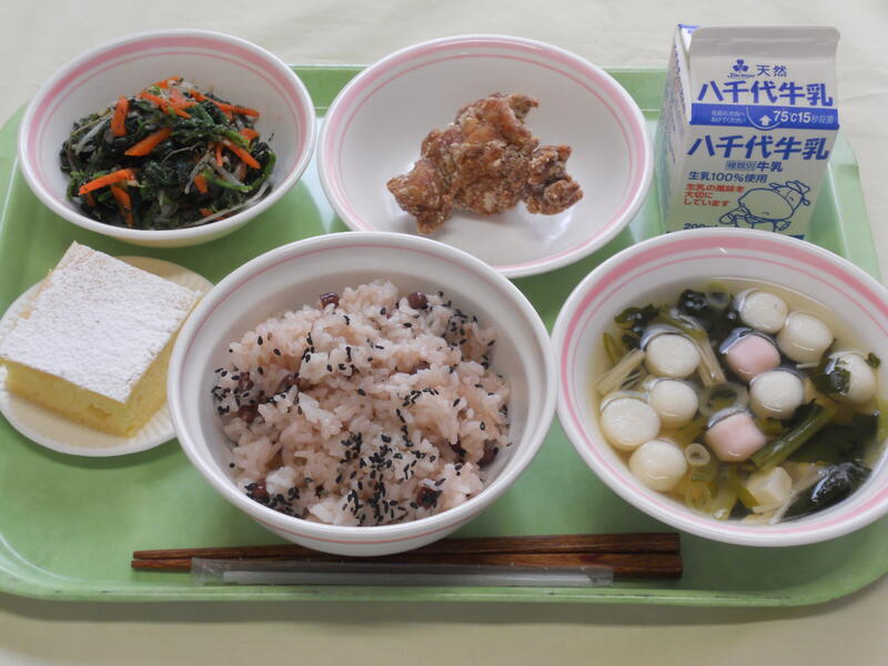 お赤飯 鶏のから揚げ ほうれんそうのごま和え 紅白すまし汁 白いんげん豆のパンケーキ 牛乳 |