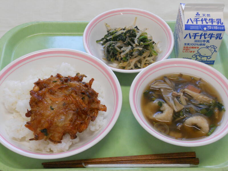 | コメント | 今日はリクエスト給食で、かみかみかきあげ丼でした。さきいかも入っていることで、いかの風味もし、よくかみました。おからポテトサラダは、ポテトサラダとさほど変わらず、酸味も程々あり、おいしくいただきました。なめこ汁の三つ葉は、香りがし、よかったです。ご馳走様でした。 |