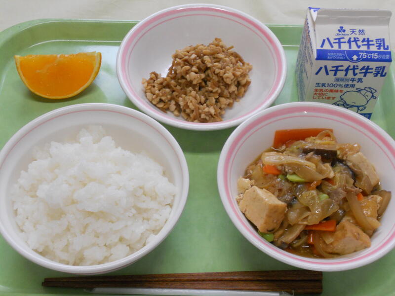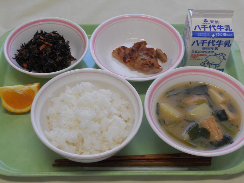 ごはん 鶏の照り焼き ひじきとツナの炒め煮 生揚げとじゃがいものみそ汁 清見オレンジ 牛乳 |
