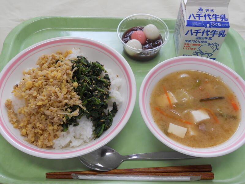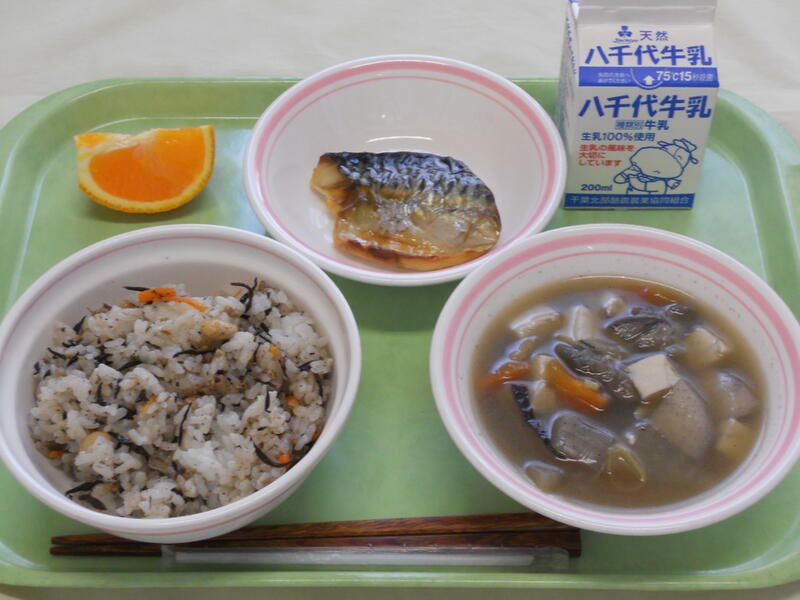 そぼろごはん さばの文化干し けんちん汁 清見オレンジ 牛乳 |