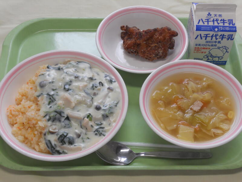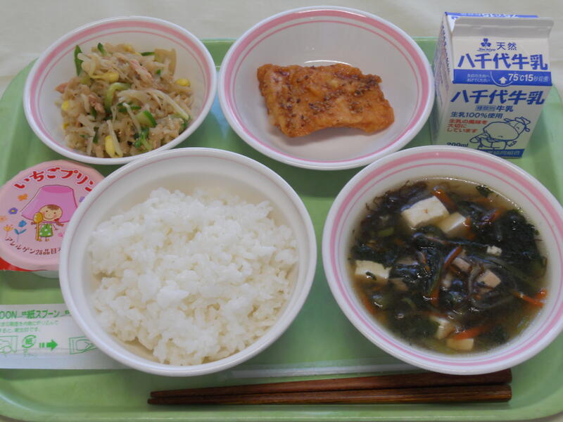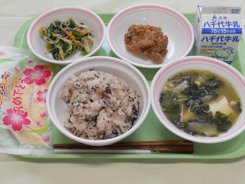 | コメント | 今日から給食がはじまりました。お祝い給食は、みんなの大好きなからあげでした。ジューシーでやわらかく、とてもおいしかったです。季節の食材、菜の花もあり、お祝い色がいっぱいの給食でした。ごちそうさまでした。 |