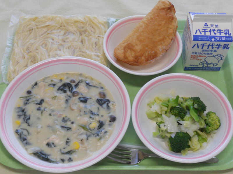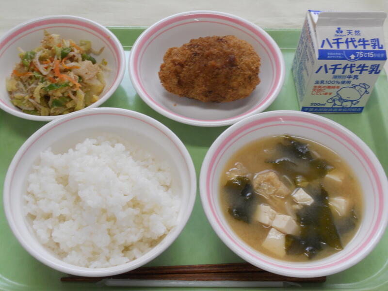 | コメント | リクエスト給食でした。たらこスパゲティは、具材と麺がよくまざっていて、おいしかったです。ミニメロンパンも、甘くて食感がよく、おいしかったです。ごちそうさまでした。 |