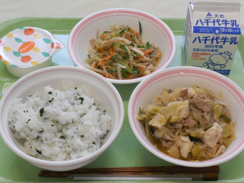 ごはん はがつおのピリットジャン おかか和え 鶏団子ちゃんこ汁 牛乳 |