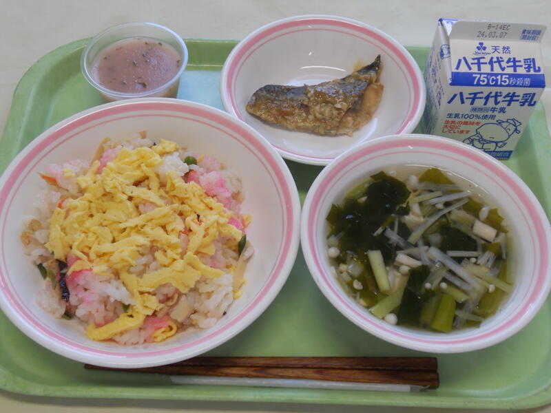 ひなちらし 鰆のごまだれ焼き 小松菜とわかめのすまし汁 桜の水ようかん 牛乳 |