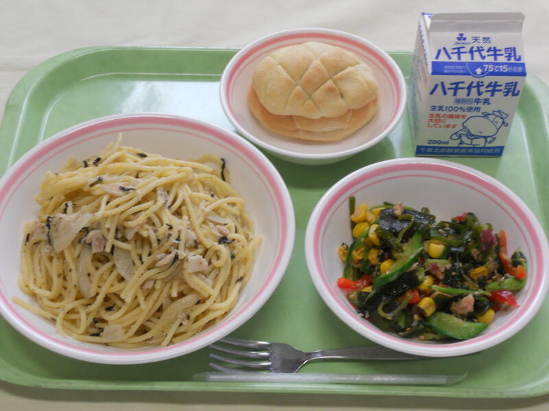 たらこスパゲティ 海藻サラダ ミニメロンパン 牛乳 |